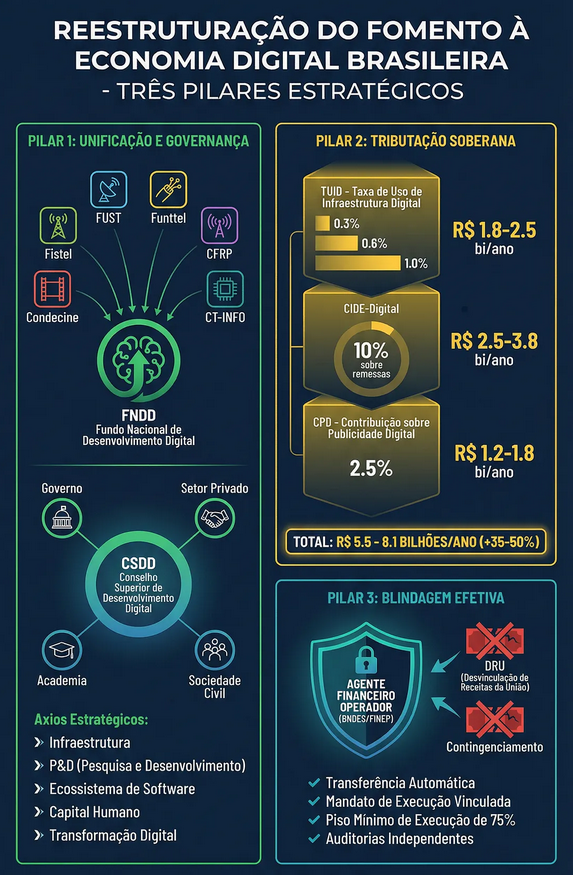 A extinção pulverizada dos fundos atuais (Fistel, FUST, Funttel, CFRP, Condecine e CT-INFO) deve dar lugar à consolidação de recursos sob um único instrumento programático: o Fundo Nacional de Desenvolvimento Digital (FNDD). Para evitar a fragmentação histórica, este fundo seria gerido por um Conselho Superior de Desenvolvimento Digital (CSDD), com composição equilibrada entre diversos ministérios do governo, setor privado (telecomunicações e plataformas digitais), academia e sociedade civil (com entidades de defesa do consumidor, inclusão digital e startups).