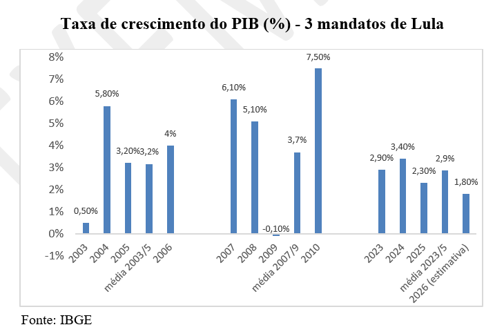 Dessa forma, o que se pode depreender da leitura das declarações acima é que o PIB de 2,3% de 2025 não foi um acidente de percurso. Na verdade, foi o resultado de um projeto construído com empenho e dedicação por parte dos principais responsáveis pela área econômica do governo. Ao contrário do que teria solicitado por Lula ainda no começo do terceiro mandato, a ele não vai ser oferecido um cenário de crescimento do PIB mais elevado para reduzir os riscos da reeleição. Na verdade, ele “recebeu” um PIB que mal chega à metade dos 5% que teria “solicitado”.