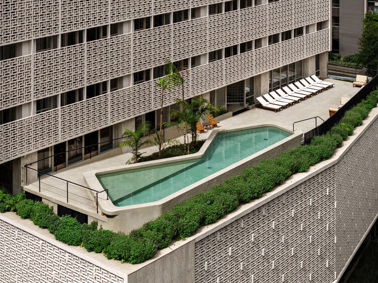 Hóspedes. O lobby do prédio exibe poltronas butterfly modernistas, luminárias desenhadas por Paulo Mendes da Rocha e um bagageiro reluzente digno de filmes antigos. Há malas pelo saguão; hóspedes aguardam o Uber ou o check-in.